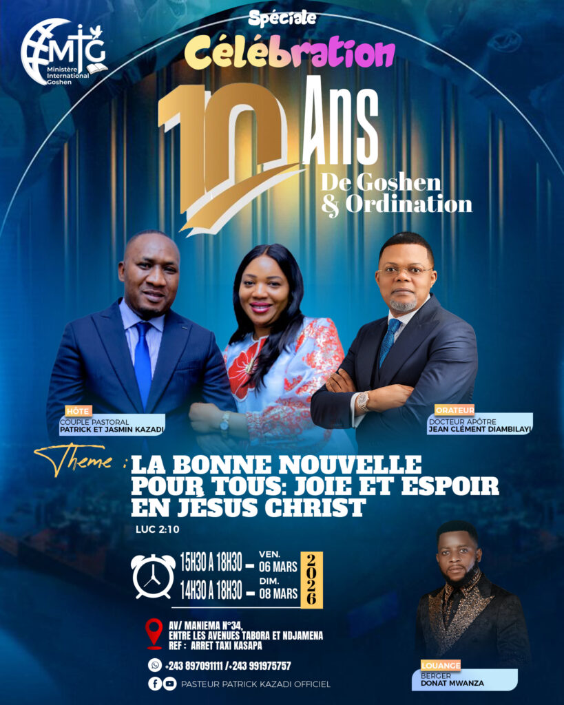 Le Ministère International Goshen vous invite avec un immense bonheur à une double célébration marquant ses 10 ans d’existence et une grande cérémonie d’ordination sous le thème inspirant de la Bonne Nouvelle pour tous avec une promesse de joie et d’espoir en Jésus-Christ.